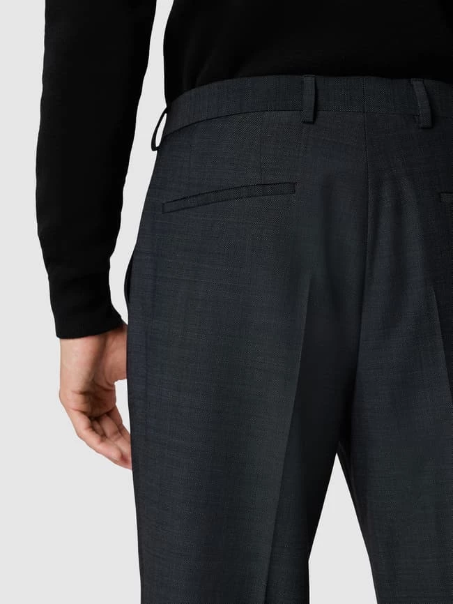 Die Hose von BOSS ist aus einem elastischen Material-Mix mit Schurwoll-Anteil gefertigt und gerade geschnitten. Sie zeigt sich mit Allover-Muster und Bügelfalten.