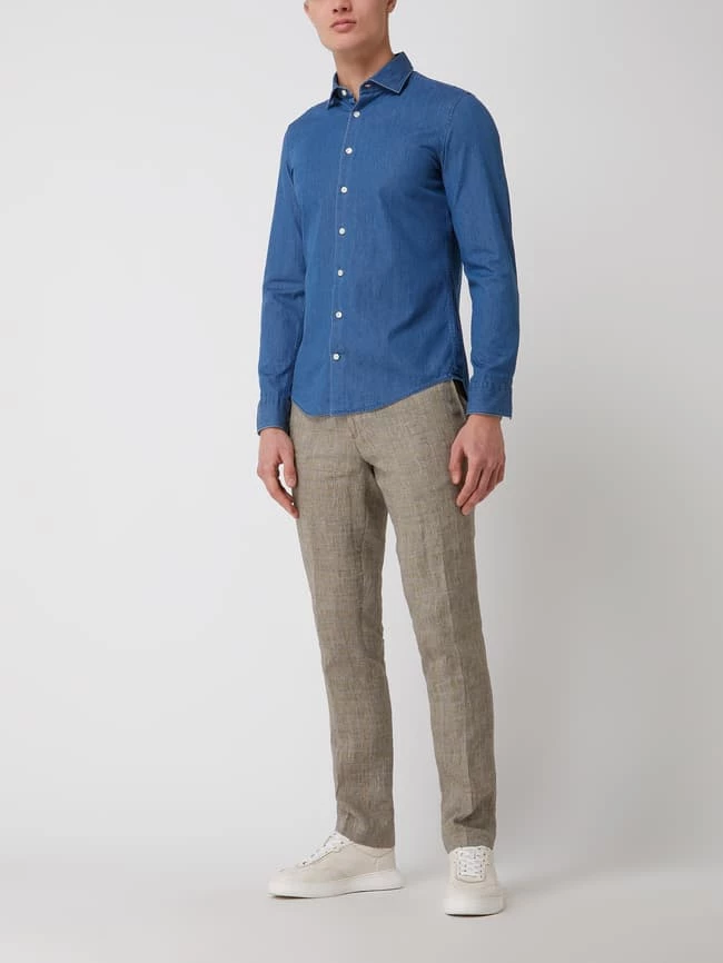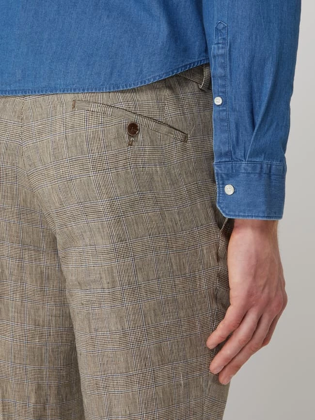 Die Anzughose von Carl Gross ist aus reinem Leinen gefertigt und gerade geschnitten. Sie kommt mit Glencheck, französischen Eingrifftaschen und Leistentaschen.