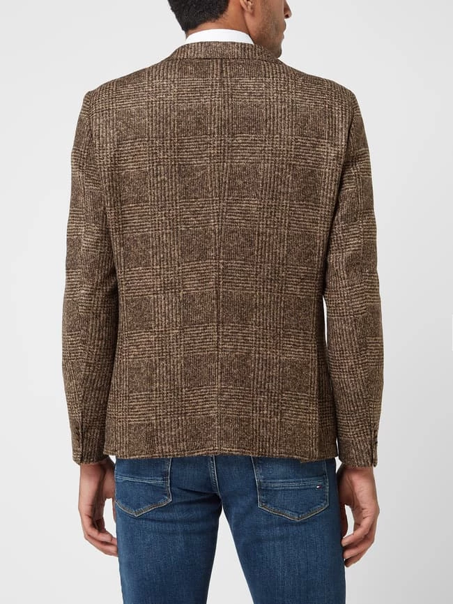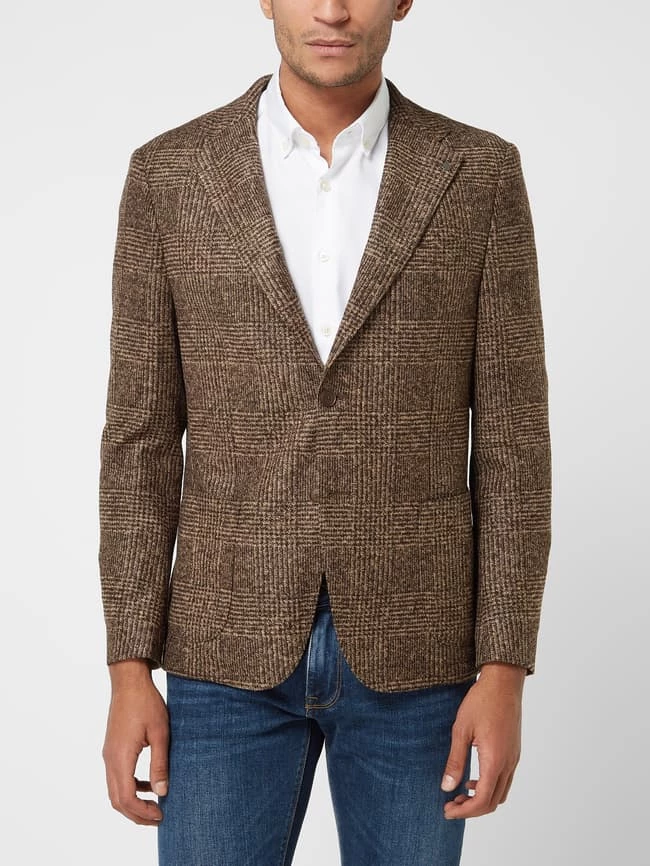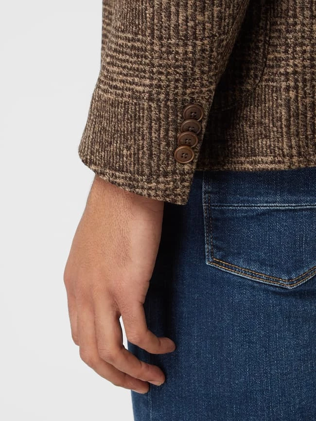 Das 2-Knopf-Sakko von DIGEL ist aus einer Materialmischung mit Woll-Anteil gefertigt. Es zeigt sich im Slim Fit mit Glencheck-Muster, Eingrifftaschen und Kissing Buttons.