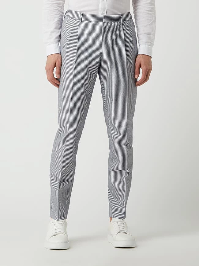 Die Anzughose von Tommy Hilfiger ist aus einer Baumwollmischung gefertigt und im Slim Fit gehalten. Sie kommt mit Streifenmuster, Bundfalten und Leistentaschen.
