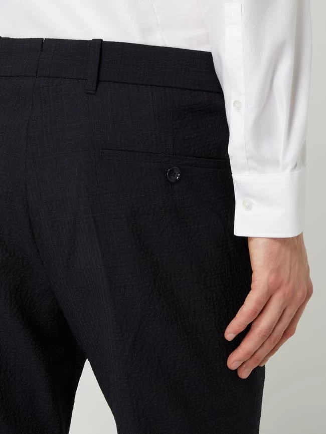 Die Anzughose von Windsor ist aus einer Schurwollmischung mit Baumwoll- und Stretch-Anteil gefertigt. Sie zeigt sich im Shaped Fit mit feinem Webmuster, geknöpften Leistentaschen und Bügelfalten.